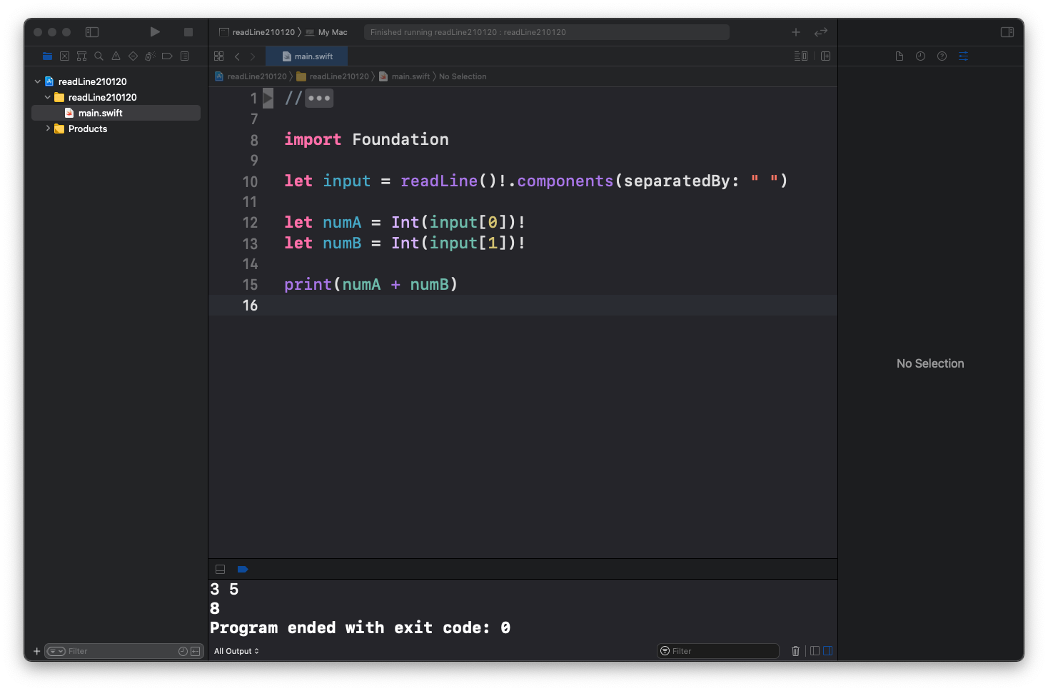 두 값을 입력받아 덧셈을 출력 input이 optional이었고 배열에 안전하게 접근하기 위해 first와 last를 사용했습니다. 그럼 optional binding으로 unwrapping 해야겠죠??
