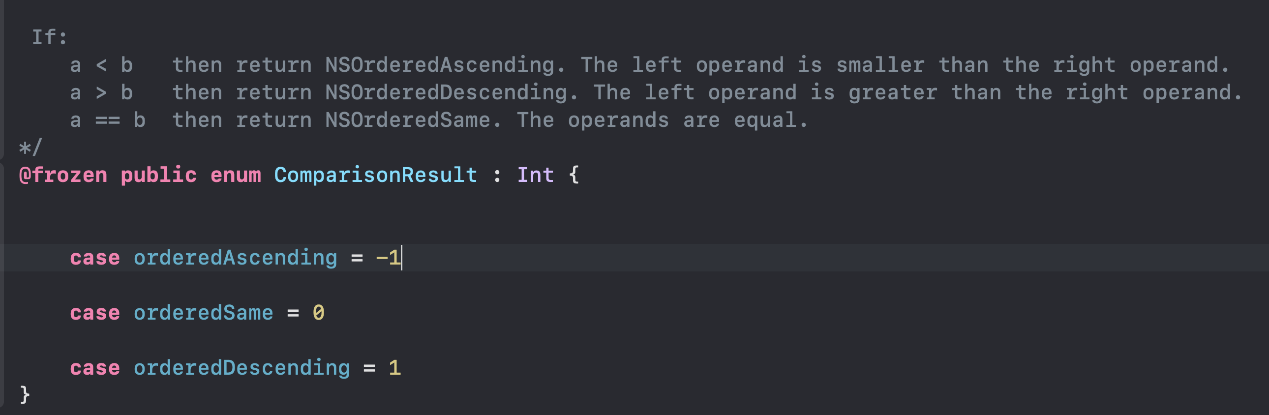 그럼 a.compare(b)이 ComparisonResult.orderedAscending와 같은지 비교 연산자로 비교하면 됩니다.
