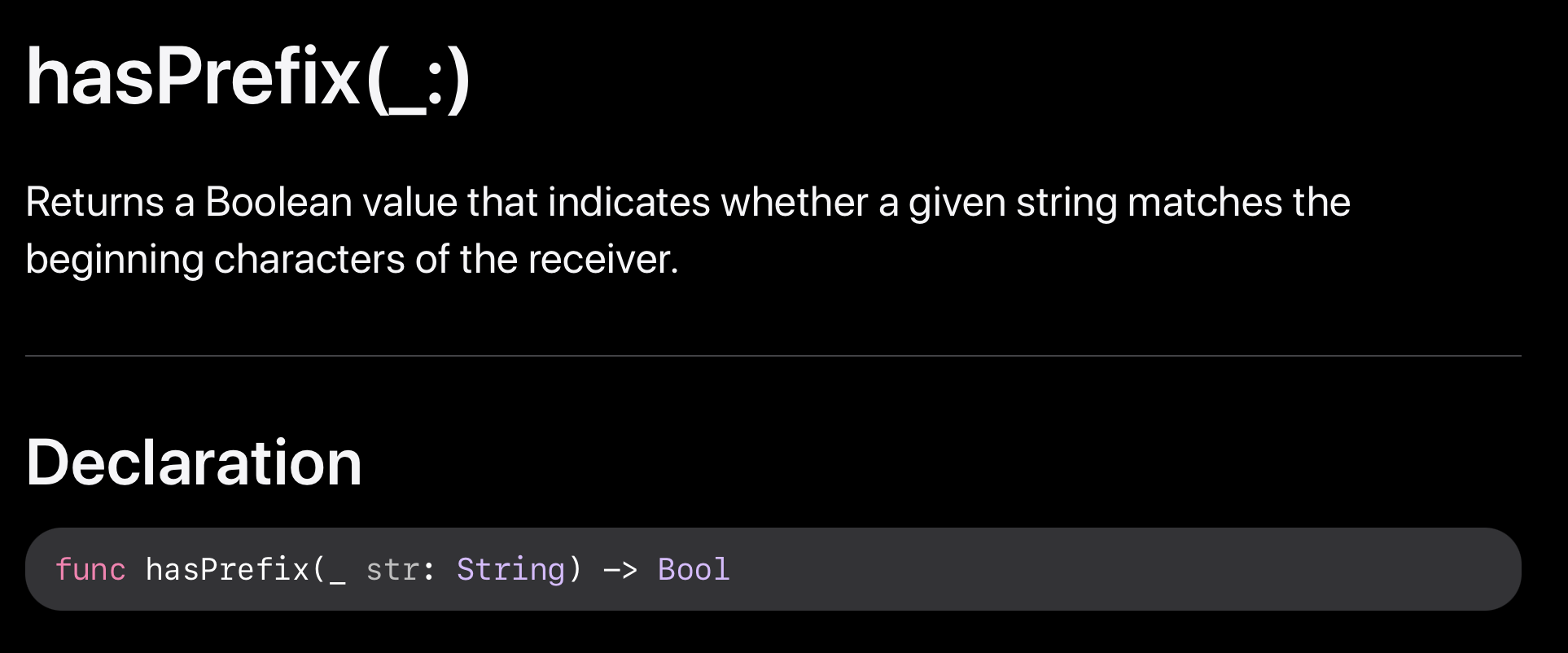 앞에서부터 Hello로 시작하므로 hasPrefix(_:)를 사용하면 true가 리턴되는 것을 볼 수 있습니다.