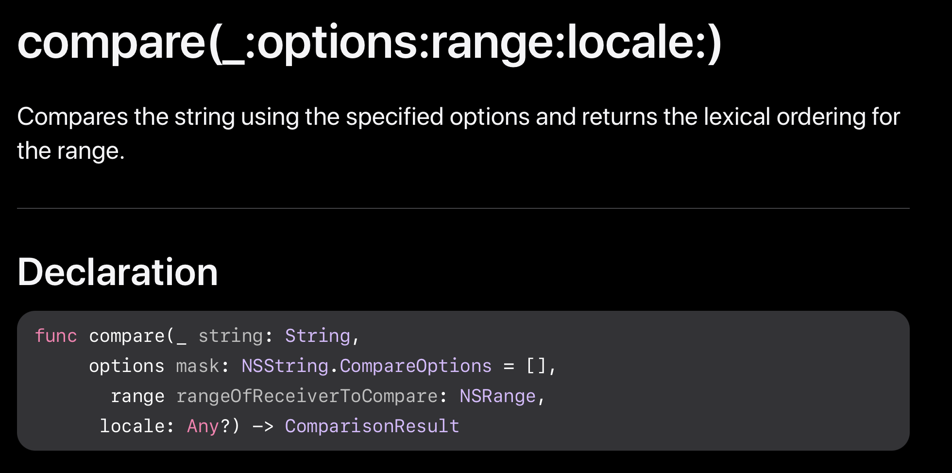 string 파라미터를 제외하고 나머지 파라미터는 모두 기본값을 가지고 있기 때문에 compare(_:)만 사용해도 됩니다.