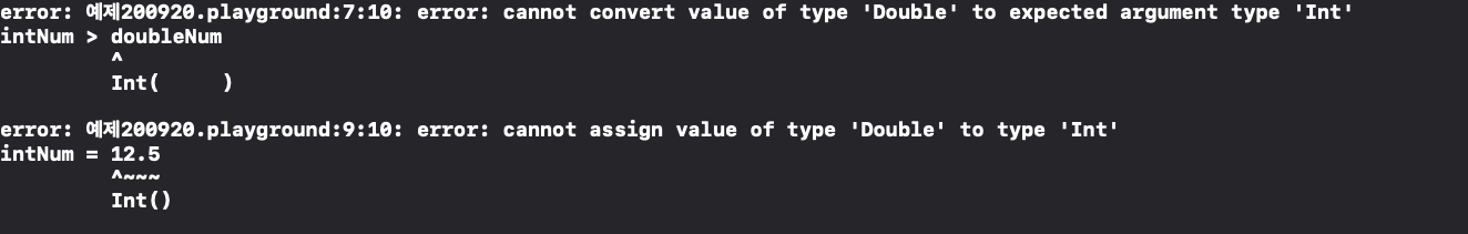 같은 수이지만 정수와 실수도 구분합니다. 이러한 오류들은 컴파일 과정에서 Swift가 발견하고 error로 알려줍니다.