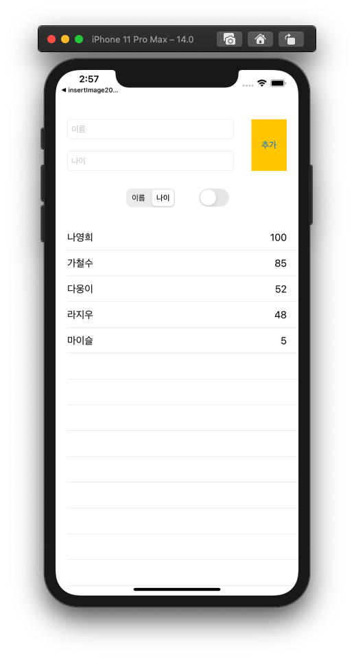 // 세그먼트인덱스가 0 or 1 그리고 버튼이 On/Off 인 경우 4가지를 switch문으로 분기해서 출력 @IBAction func typeChanged(_ sender: UISegmentedControl) { let property = sender.selectedSegmentIndex == 0 ? "name" : "age" sortList(personProperty: property, isAsending: sortChangeSwitch.isOn) listTableView.reloadData() } // 세그먼트인덱스가 0 or 1 그리고 버튼이 On/Off 인 경우 4가지를 switch문으로 분기해서 출력 @IBAction func sortChangeSwitch(_ sender: Any) { let property = sortTypeSegment.selectedSegmentIndex == 0 ? "name" : "age" sortList(personProperty: property, isAsending: sortChangeSwitch.isOn) listTableView.reloadData() }전과 비교하면 아주 많이 줄어들었다.