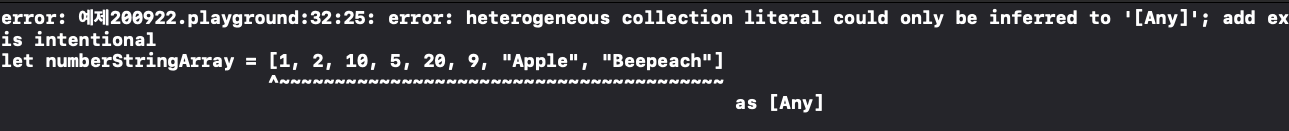 타입이 한가지가 아니면 에러가 발생합니다. 배열을 생성하는 가장 쉬운 방법은 Array literal을 이용하는 방법입니다.