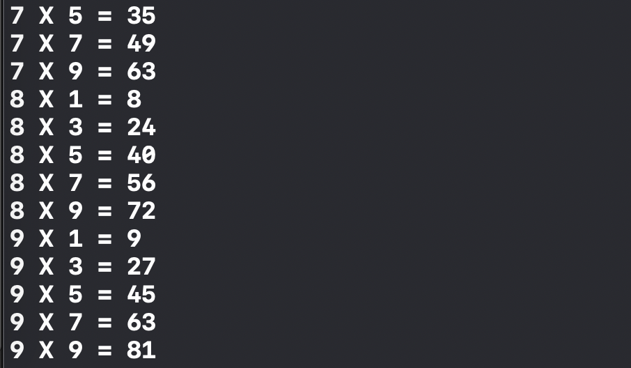 짝수단은 출력되지 않습니다. 이번에는 짝수인 2, 4, 6, 8단은 출력되지 않았습니다. 코드의 흐름을 따라가 보겠습니다.