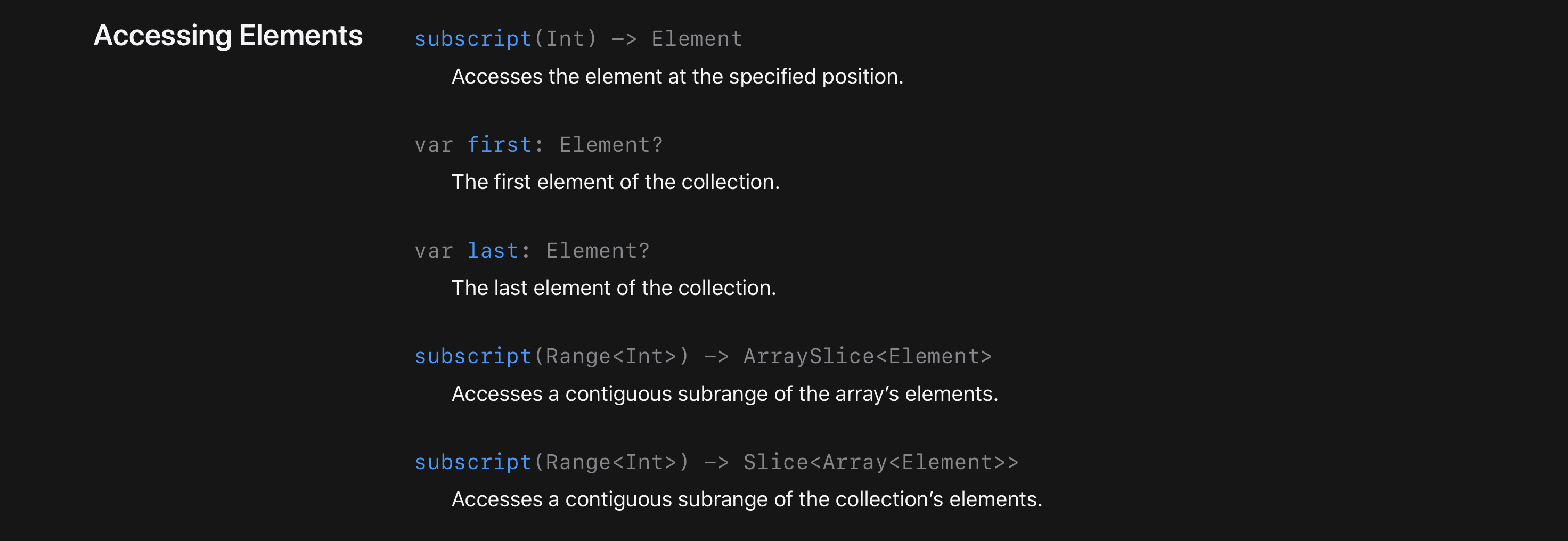 래퍼런스에 가서 Array를 보면 이렇게 subscript가 이미 구현되어 제공되는 것을 볼 수 있습니다.