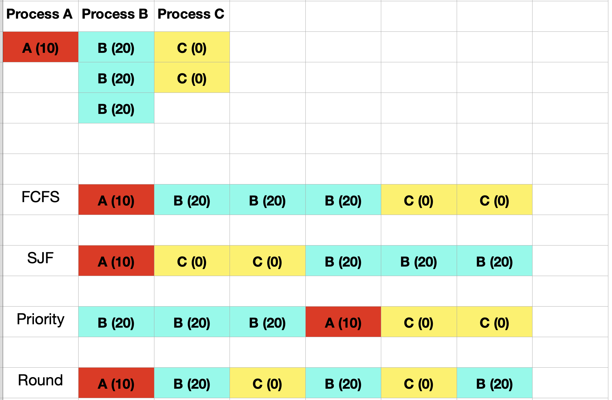 프로세스 A, B, C에 대해서 각각 알고리즘 별로 프로세스가 어떻게 스케줄 되는지를 보여주는 그림입니다.