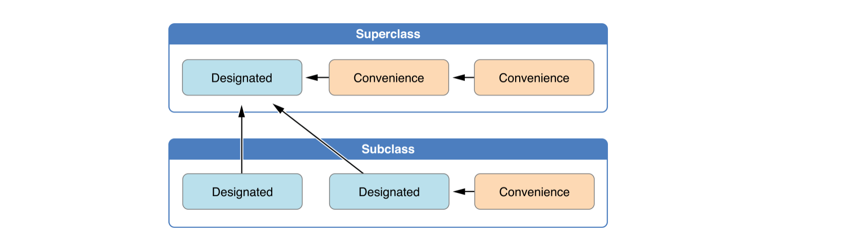 위 그림은 superclass는 1개의 defignated와 2개의 convenience init을 가지는 것을 나타내고 있습니다.