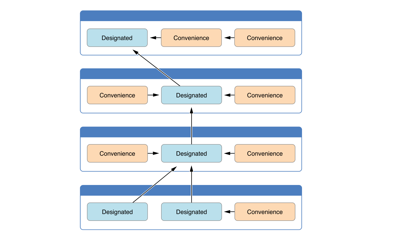 Subclass의 designated init이 superclass의 designated init을 호출하고 있으며 모든 convenience init은 같은 class의 init을 호출하고 결과적으로 마지막에는 degisngated init을 호출하는 것을 확인할 수 있습니다.