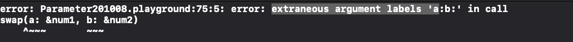 func swap<T>(_ a: inout T, _ b: inout T)여기서 아규먼트 레이블이 _ 으로 생략돼있는데 호출문에서 a, b를 사용하려 하니 에러가 발생한 것이었다.
