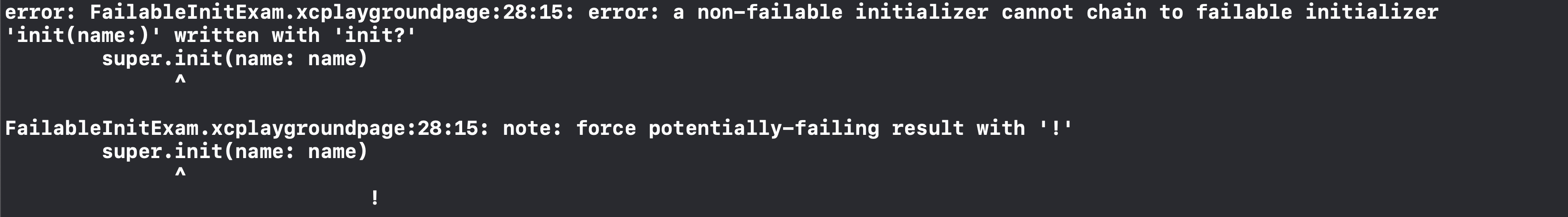 Superclass의 failable init을 subclass에서 호출하기 위해서는 해당 init이 failable init으로 선언되어있어야하거나 ! (force - unwrap)을 이용해서 superclass의 failable init의 결과를 unwrapping 해야 합니다.