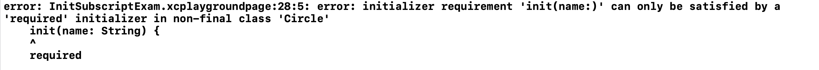 주의하실 점은 required init은 override 키워드를 작성하지 않는다면서?!?라고 생각하실 수 있는데 프로토콜을 채용할 때는 조금 달라집니다. override 키워드를 작성하지 않는 경우는 위의 Circler과 Elipse의 경우입니다.