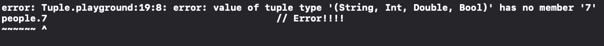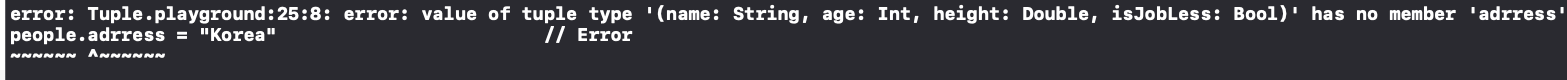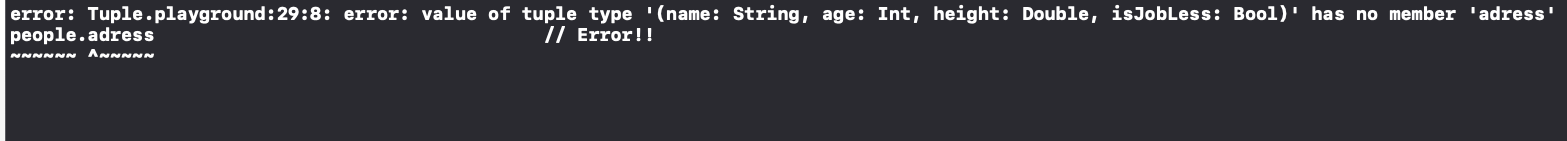 Unnamed Tuple과 달리 Type 앞에 name: 이 추가됐습니다. 이렇게 이름을 추가해주면 Member들이 의미하는 값이 무엇인지 한눈에 알아볼 수 있죠??