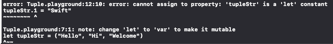 tupleStr은 let으로 선언되었기 때문에 member를 바꿀 수 없다는 에러메세지가 출력됩니다. var로 선언한 Tuple만 변경이 가능합니다.