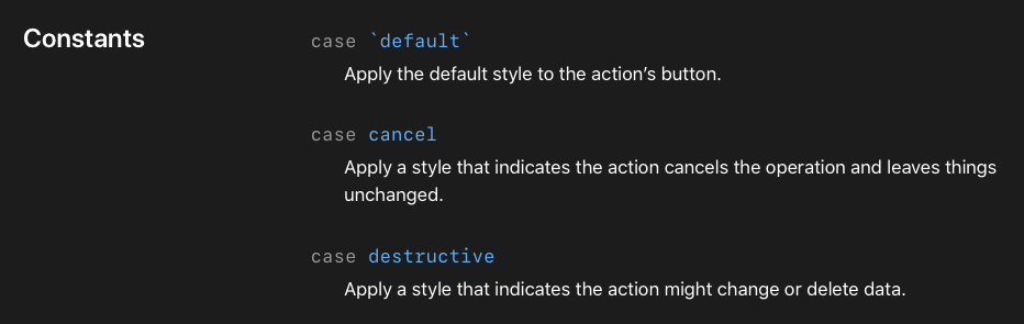 눈에 띄는 변화는 별로 없다. style Additional styling information to apply to the button. Use the style information to convey the type of action that is performed by the button. For a list of possible values, see the constants in UIAlertAction.Style.