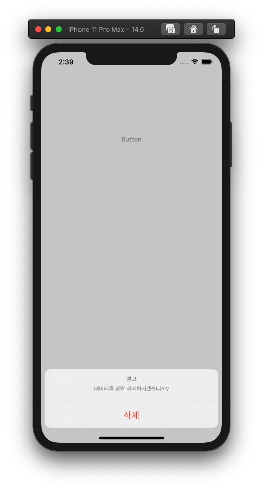 이런 느낌?? 이였던거 같다. import UIKit class ViewController: UIViewController { @IBAction func presentAlert(_ sender: Any) { let makeAlert = UIAlertController(title: "경고", message: "데이터를 정말 삭제하시겠습니까?", preferredStyle: .actionSheet) let actionAlert = UIAlertAction(title: "삭제", style: .destructive) makeAlert.addAction(actionAlert) present(makeAlert, animated: true) } override func viewDidLoad() { super.viewDidLoad() // Do any additional setup after loading the view. } }마지막 ActionSheet의 코드이다.