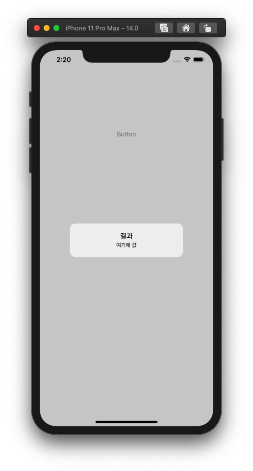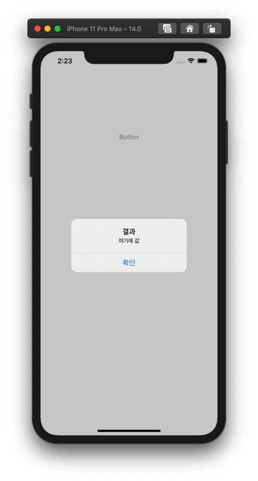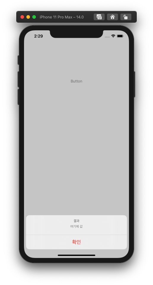 확인 버튼이 생겼다. let makeAlert = UIAlertController(title: "결과", message: "여기에 값", preferredStyle: .actionSheet)UIAlertController 인스턴스의 preferredStyle 속성을 .actionSheet으로 바꿔봤다.