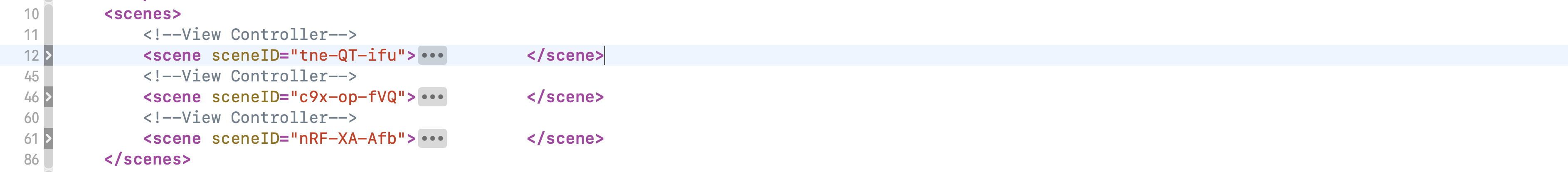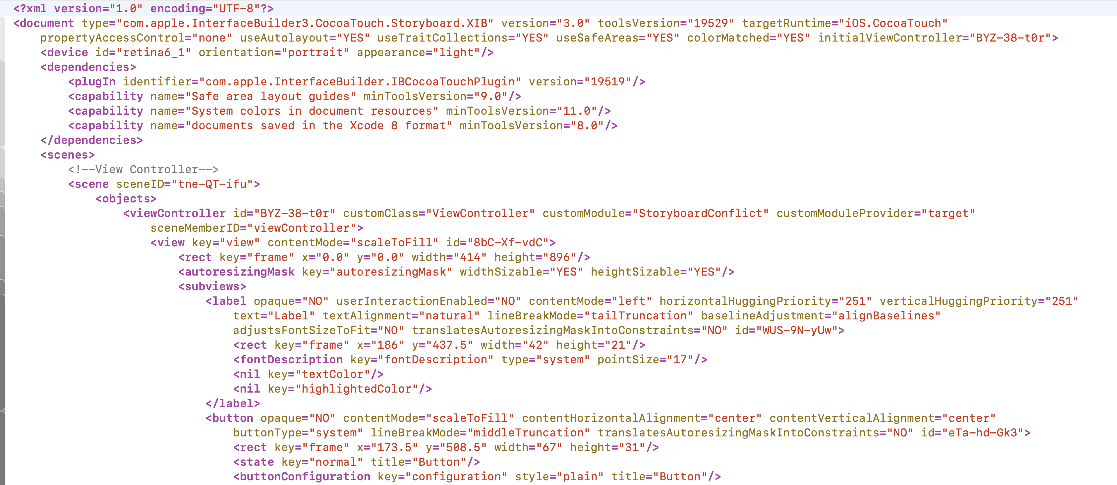 이 경우는 각각 팀원이 동일한 storyboard에서 서로 다른 새로운 Scene을 추가했는데 InterfaceBulider가 XML에서 같은 Line에 Scene관련 코드를 추가할 때 발생합니다.