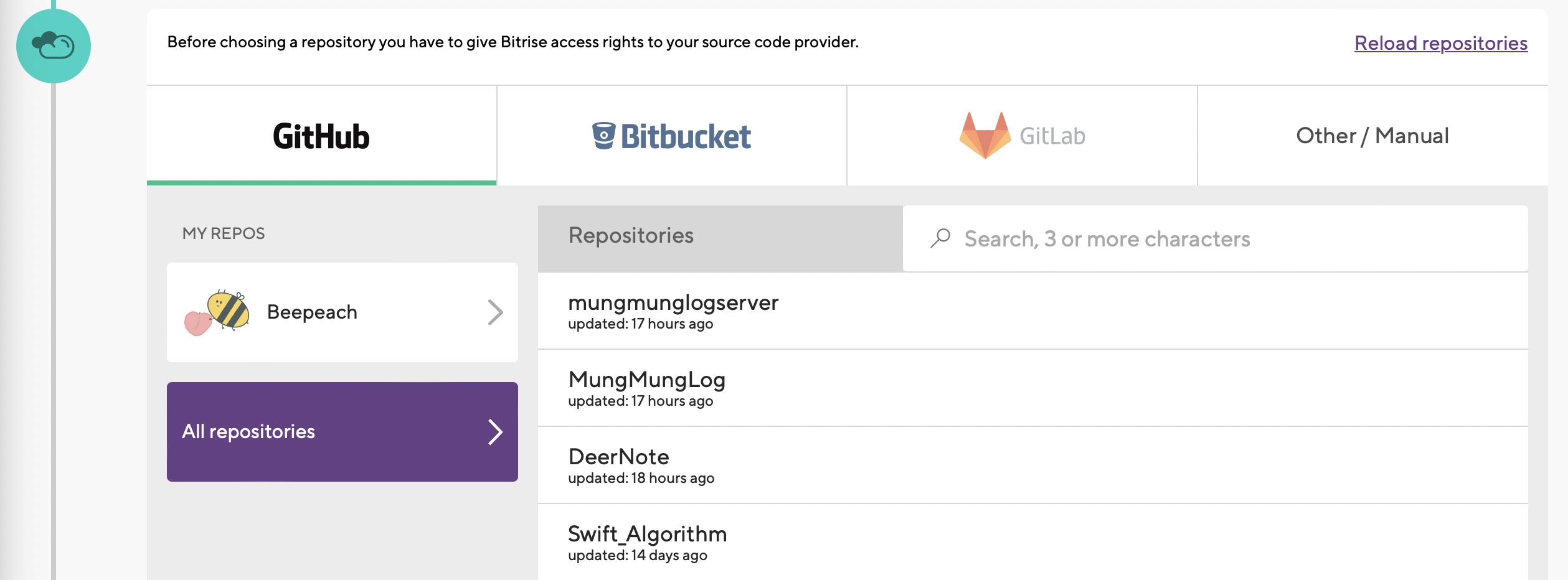 만약 앱의 remote repo를 github이 아닌 다른 서비스를 이용하고 있다면 해당 서비스와 연결해주어야 합니다.