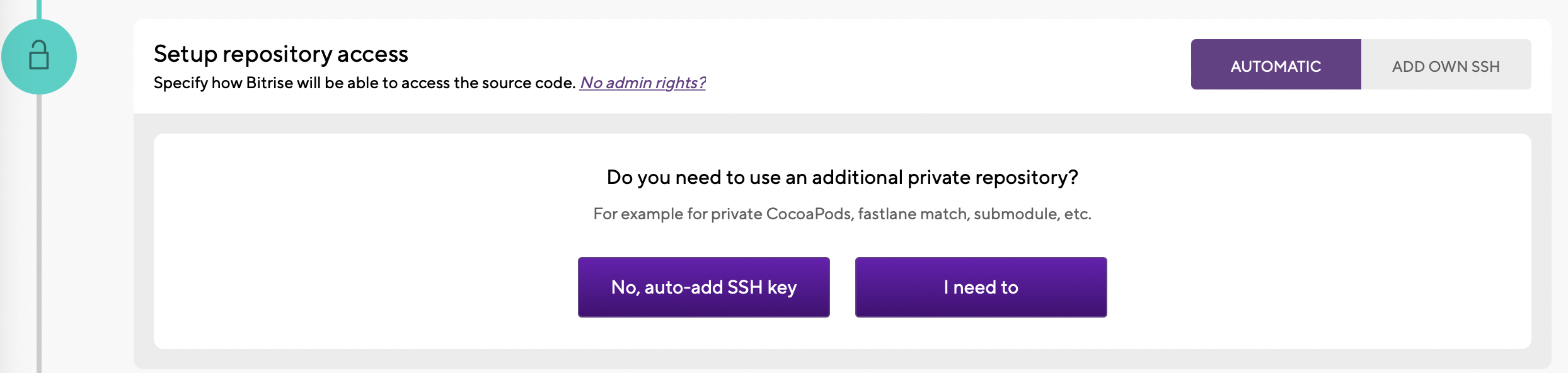 추가적인 private repo를 사용할 거냐고 물어보는데 딱히 필요 없으므로 No. auto-add SSH key를 선택하면