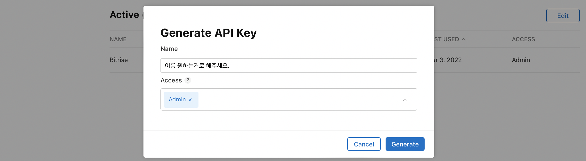이름은 원하는 것을 입력하고 Access는 Admin으로 해줍니다.