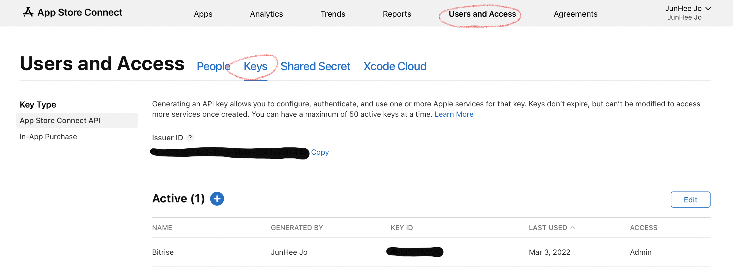 앱스토어 커넥트에서 상단에 User and Access -> Keys로 이동하고 key를 생성합니다
