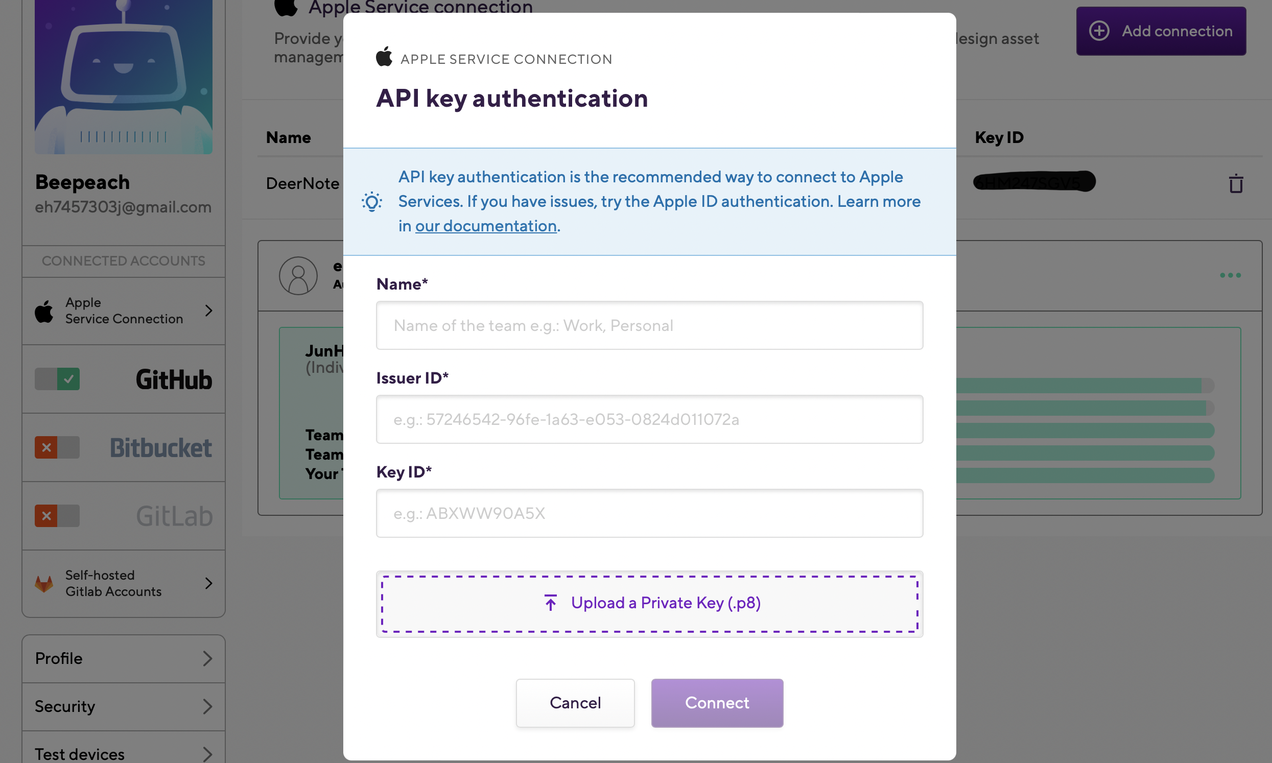 Add connection을 누르시면 이런 화면이 나타나는데 IssuerID, KeyID, private Key file은 모두 앱스토어 커넥트 keys에 나와있습니다.