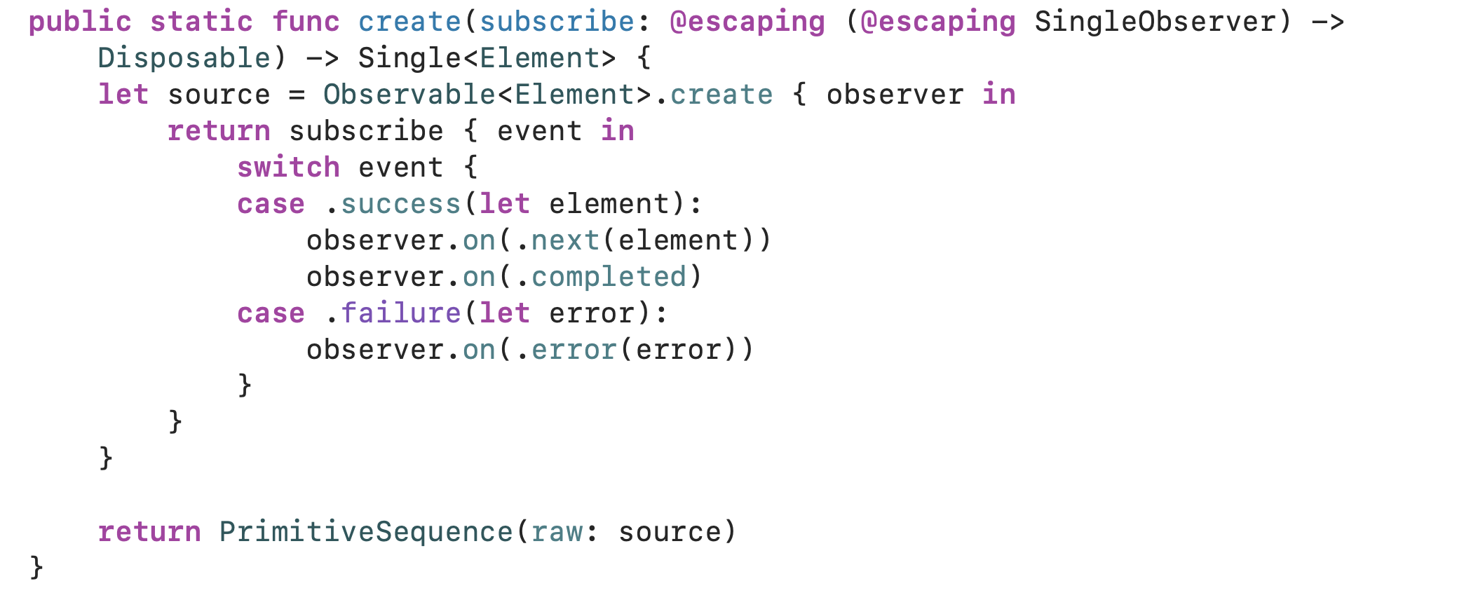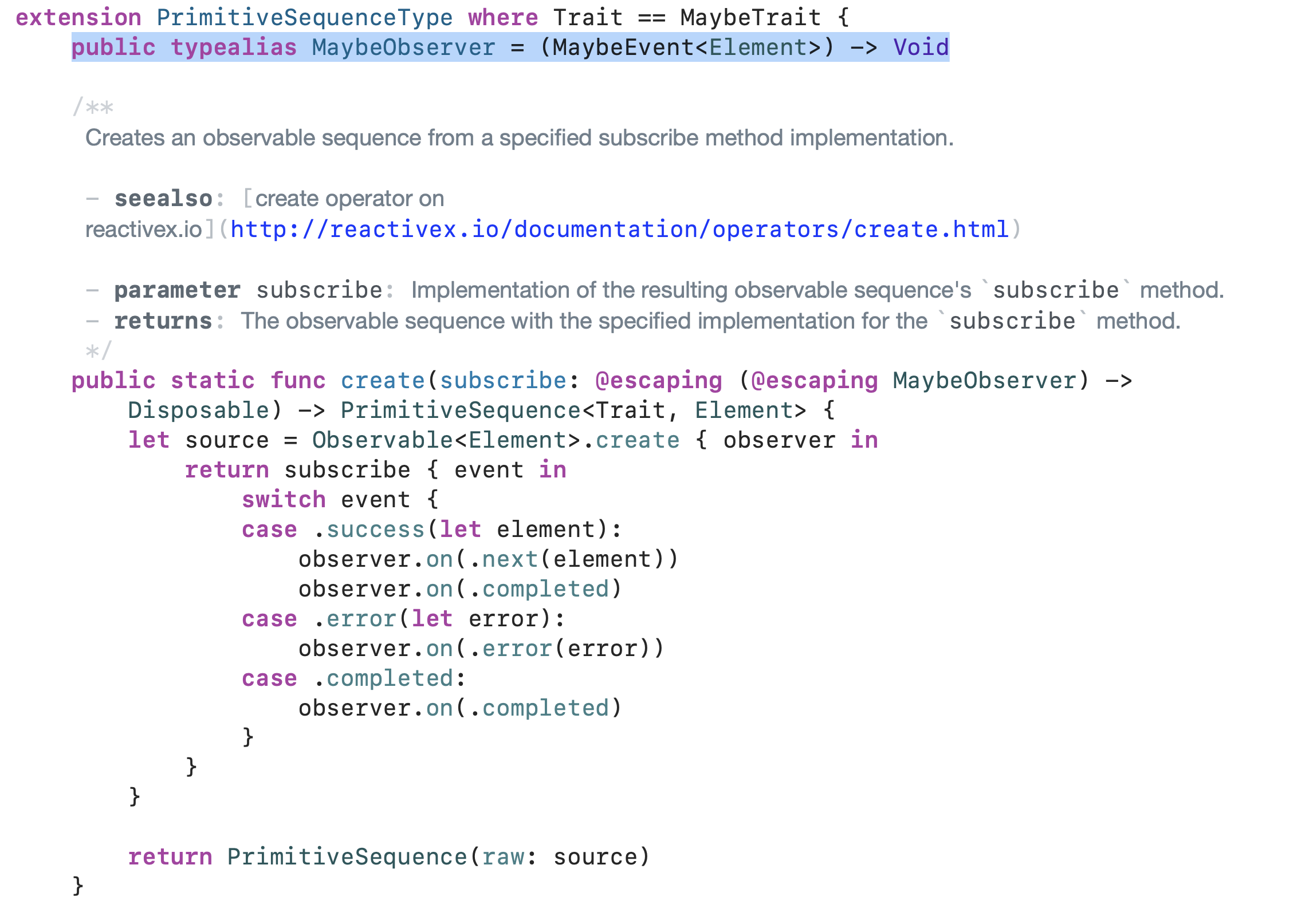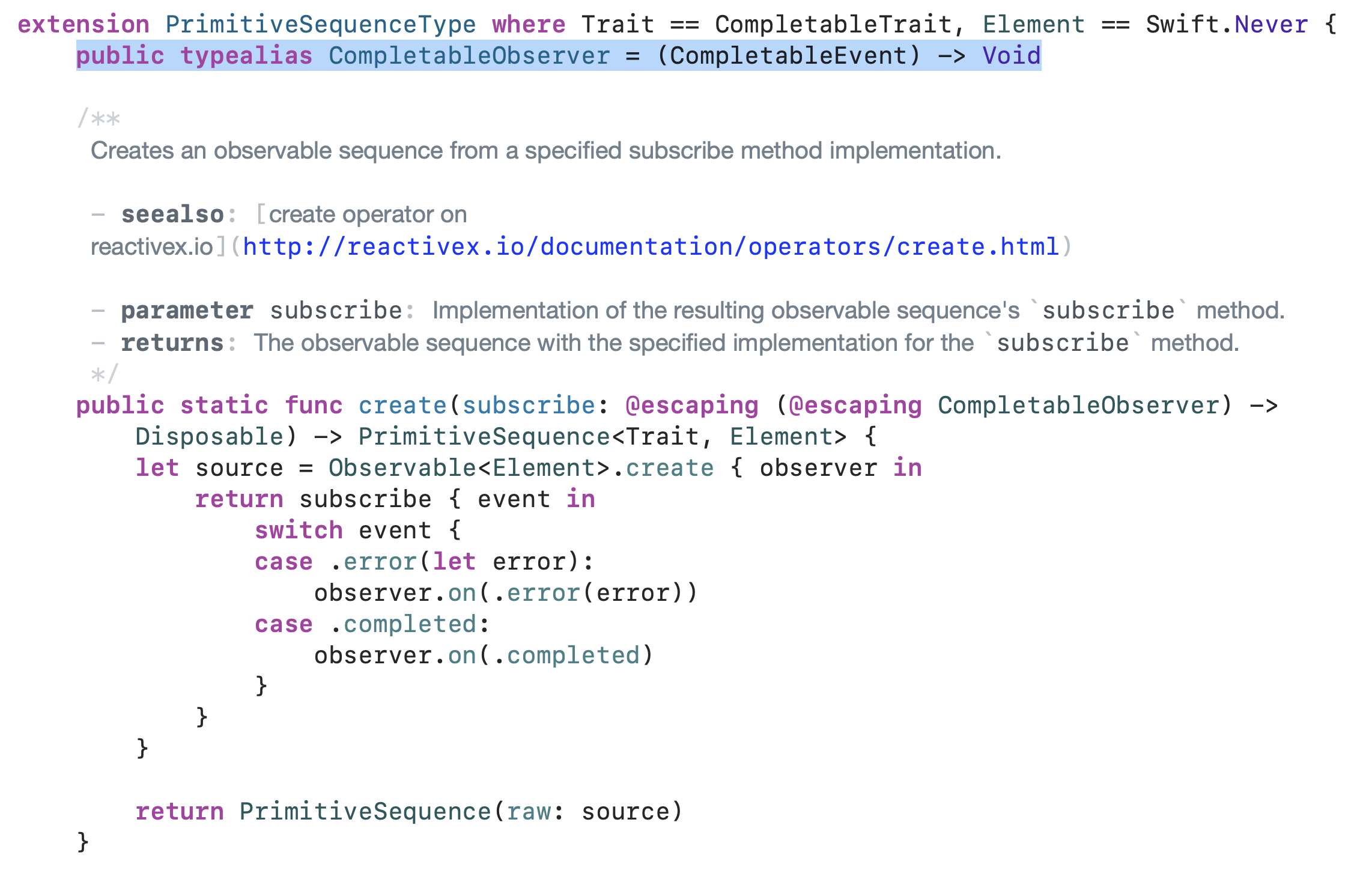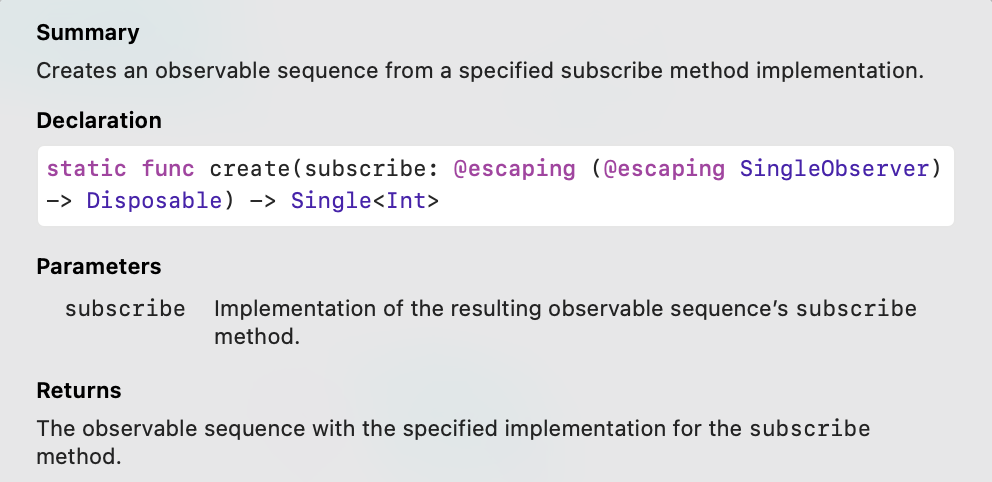 Single의 타입메서드인 create 오퍼레이터를 확인해보면 우리가 이전에 사용하던 create 오퍼레이터와 다른 점이 보입니다.