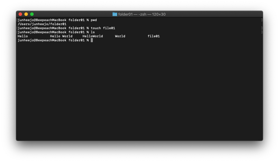 touch file01을 입력한 화면 우리가 만든 folder01 dir에 file01을 생성했습니다.