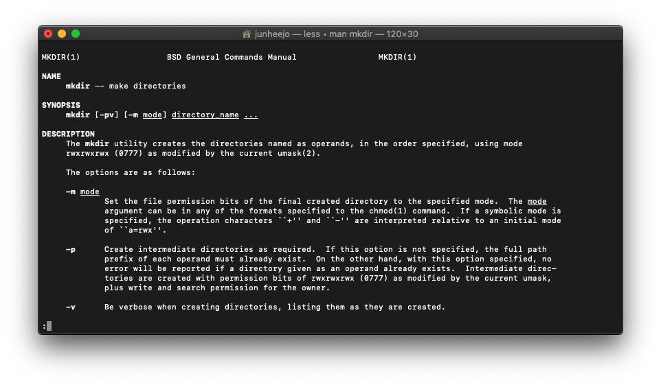 man mkdir를 입력한 화면 매뉴얼은 시간이 있으시면 읽어보시는 걸 추천드립니다.