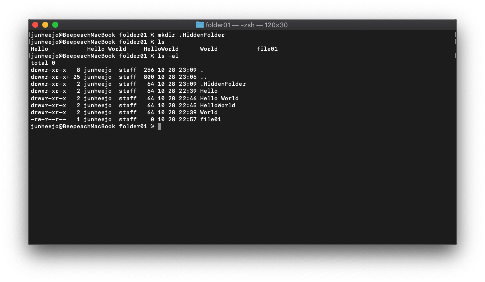 그리고 mkdir .HiddenFolder로 생성한 보이지 않는 dir을 볼 수 있습니다.