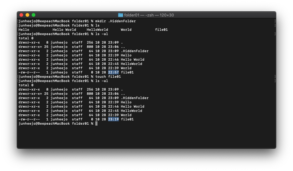 touch file01을 다시 입력한 화면 /folder01 dir에는 file01이라는 file이 이미 존재하므로 새로운 file01 생성된 것이 아니라 생성 시간이 22:57 → 23:19으로 touch file01을 입력했을 때의 시간으로 변경되었습니다.