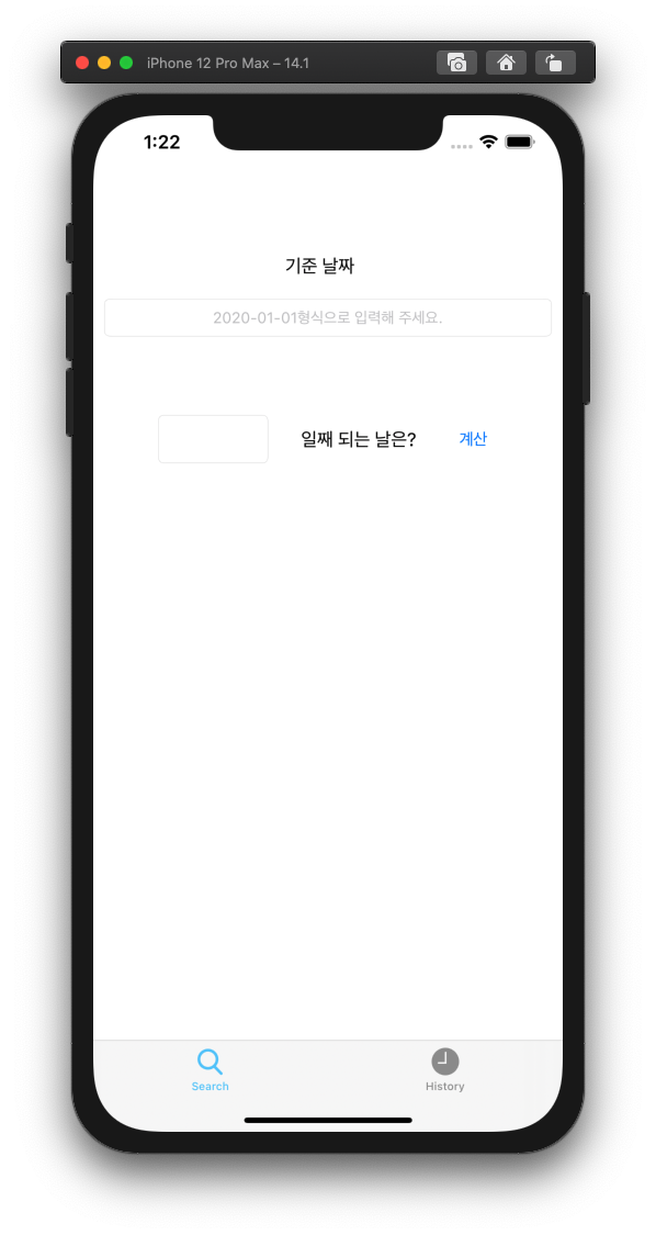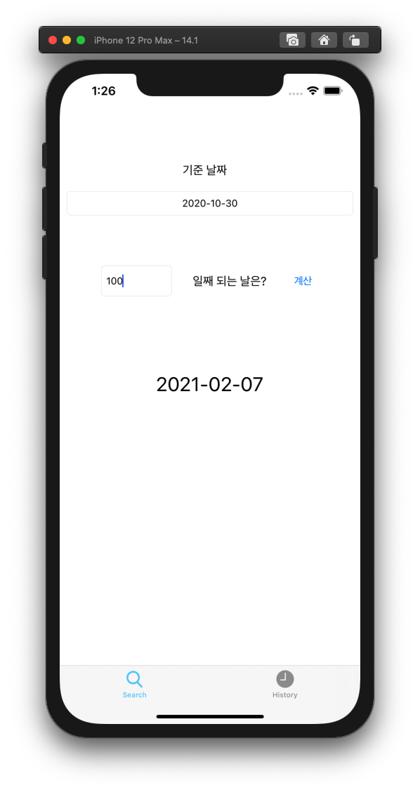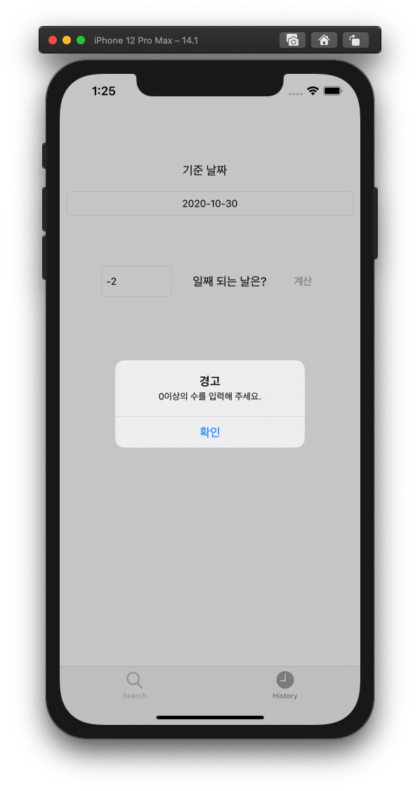 class ViewController: UIViewController { @IBOutlet weak var standardDayField: UITextField! @IBOutlet weak var afterDayOfStandardDayField: UITextField! @IBOutlet weak var calculatedDateLabel: UILabel! @IBAction func calculateDateButton(_ sender: Any) { let dateRegularExpression = #"([12]\d{3}-(0[1-9]|1[0-2])-(0[1-9]|[12]\d|3[01]))"# guard let StandardDateText = standardDayField.text, StandardDateText.count > 0 else { presentAlert(message: "날짜를 입력해 주세요.\n예) 2020-01-01") return } guard let range = StandardDateText.range(of: dateRegularExpression, options: .regularExpression), range.lowerBound == StandardDateText.startIndex && range.upperBound == StandardDateText.endIndex else { presentAlert(message: "올바른 날짜를 입력해 주세요.\n예) 2020-01-01") return } guard let afterDayText = afterDayOfStandardDayField.text, let afterDay = Int(afterDayText), afterDay >= 0 else { presentAlert(message: "0이상의 수를 입력해 주세요.") return } let calendar = Calendar.current let dateFormatter = DateFormatter() dateFormatter.dateStyle = .full dateFormatter.dateFormat = "yyyy-MM-dd" guard let formattedStandardDate = dateFormatter.date(from: StandardDateText) else { return } calculatedDateLabel.text = dateFormatter.string(for: calendar.date(byAdding: .day, value: afterDay, to: formattedStandardDate)) } func presentAlert(message: String) { let alert = UIAlertController(title: "경고", message: message, preferredStyle: .alert) let alertAction = UIAlertAction(title: "확인", style: .default, handler: nil) alert.addAction(alertAction) present(alert, animated: true, completion: nil) }날짜를 구별하는 방법은 Regular Expression을 이용하여 구별하도록 하였는데 날짜를 입력받지 말고 DatePicker를 이용하면 이러한 코드도 쉽게 줄일 수 있다.